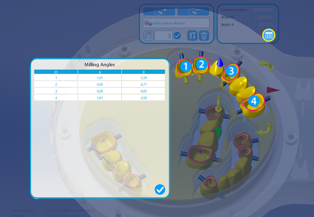 A new “Object Analysis” option has been introduced on the right-side bar of the calculation interface that allows users to verify their toolset selection is correct before the full project calculation is completed, saving time. This option is only available if you have a disk holder as fixture and if you are about to mill one of the following dental objects: Abutment (TS3), Implant bridge (TS4), Anatomic implant bridge S12), Bar (TS15), Anatomic Abutment (TS21).